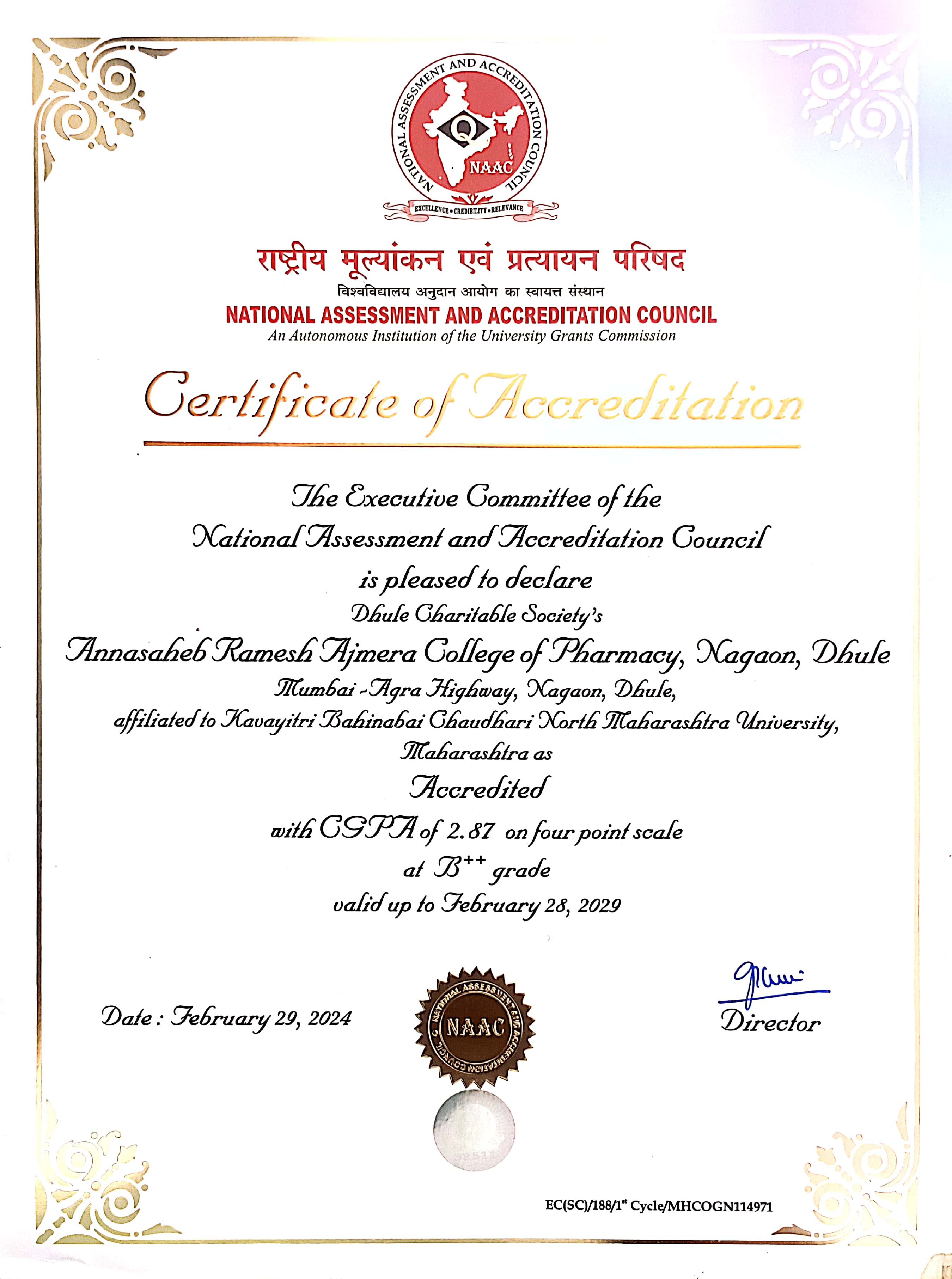 "Dhule Charitable Society was established in 1901 and is a renowned NGO of Northern Maharashtra imparting Quality Education. The DCS group of Institution specializes in providing comprehensive teaching - learning facilities, in a wide spectrum. DCS's A.R.A. College of Pharmacy established in 1994 and our campus is sprawled in a well place 13 acres land. It is one of the institute of DCS. The campus nature is self-sufficient for production of better quality students as per market demand. We promise for enriching the enriching skill, knowledge, attitude and training. Right from its establishment the institute has maintain the quality of education. The institution has accredited twice from June 2019 up to 2025 by National Board of Accreditation, New Delhi."