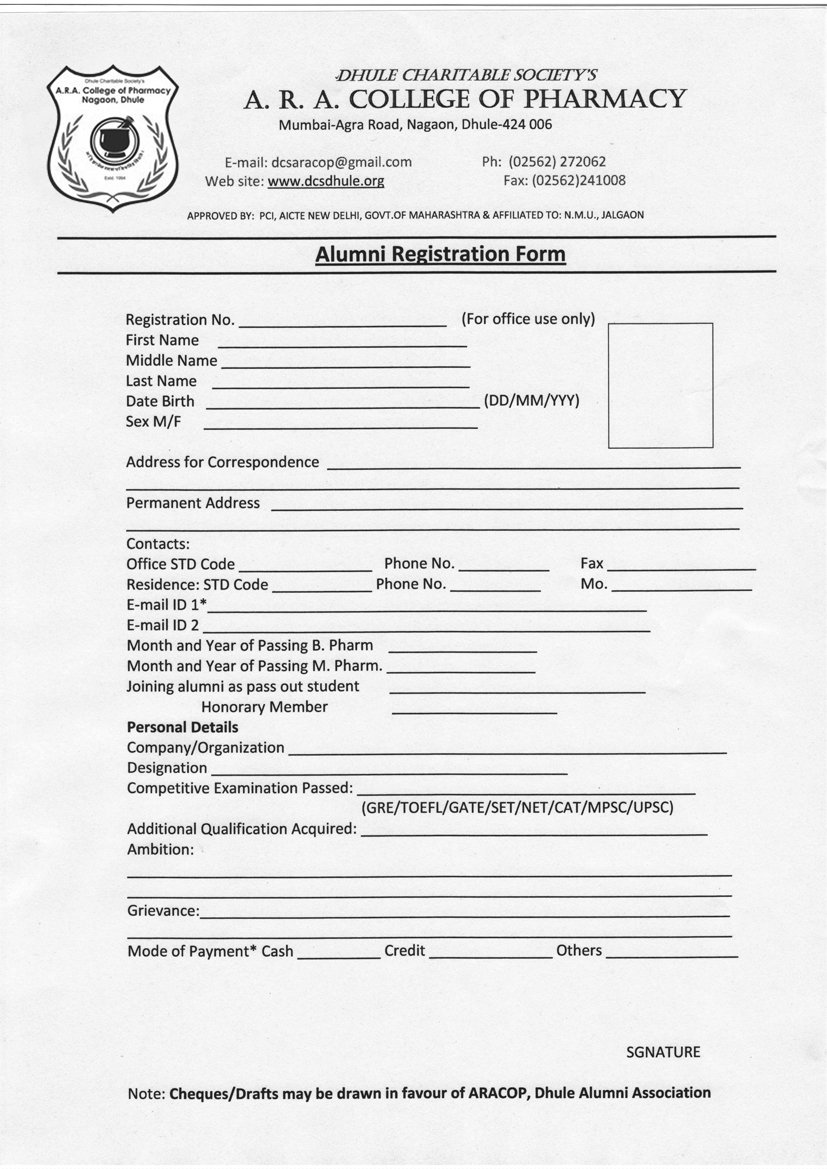"Dhule Charitable Society's Annasaheb Ramesh Ajmera College of Pharmacy is established in 1994. DCSARACOP Alumni Association creates and maintains a life-long connection between the Institute and its alumni. Alumni Association is a registered society according to section 20 of Societies Registration Act., 1860 & under the Office of Assistant Charity Commissioner, Dhule. The society was officially registered vide Registration No. MAH/193/2022. ALUMNI ASSOCIATION is a registered organization of professional students passed out from the College and engaged in multi-facets of pharmacy profession. The organisation is promised to develop technically more competent, researches and socially obliged moral pharmacists to cure human sufferings. Alumni Association works to connect alumni, support students and build an unforgettable Institute experience through a diversity of events, programming and services. Alumni Association is one of the easiest ways to reconnect, give back to the Institute, and serve as a springboard for further involvement. "